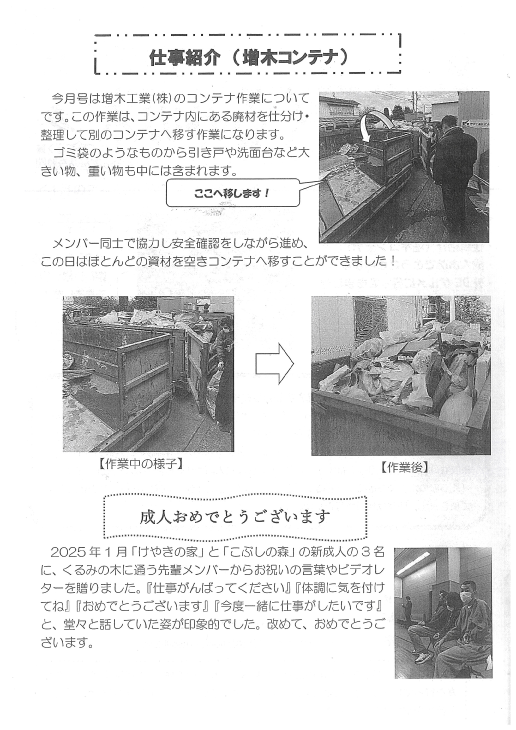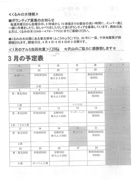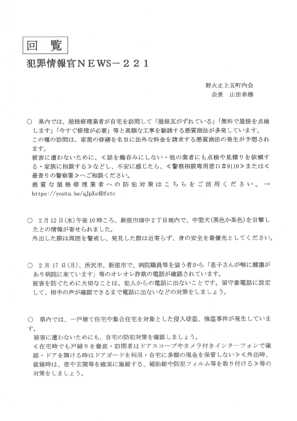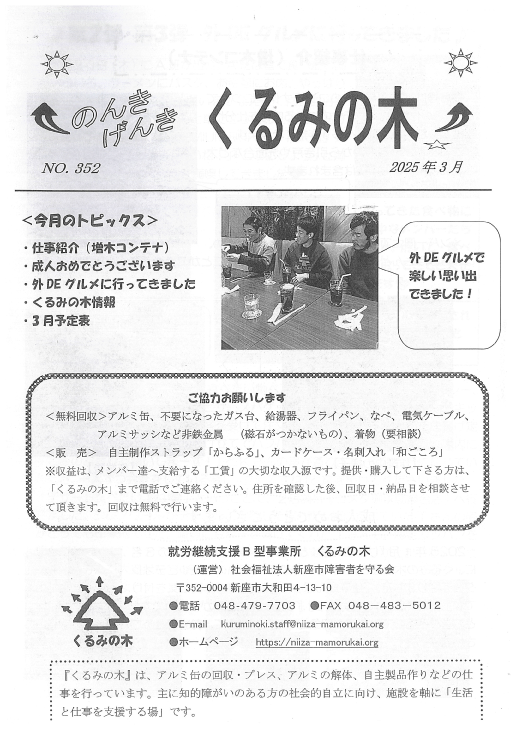 回覧板 2025年3月3日 回覧板 2025.03.05 刑法犯認知件数(警察署別・市町村別) 還付金詐欺に注意! 社会福祉法人新座市障害者を守る会新座市障害者を守る会は、障がいのある本人一人ひとりの望む生活を叶えていきます。 そのために私達は障がいのある本人を中心に本人の家族や支援者、地域、それぞれの想いや力をつなぎ合わせます。 これらの交流により、つながりのあるあたたかい地域となる...