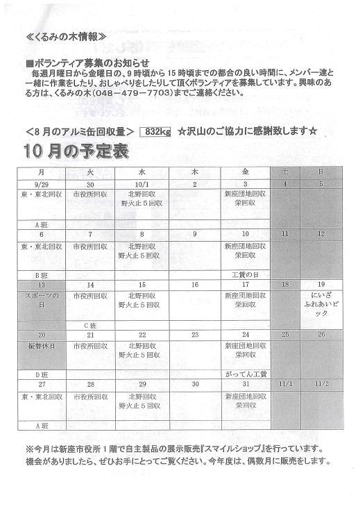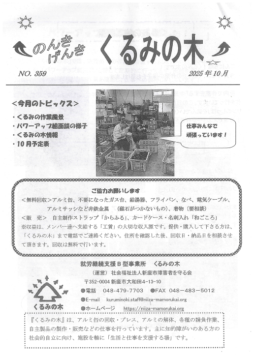 回覧板 2025年10月6日 回覧板 2025.10.06 社会福祉法人新座市障害者を守る会新座市障害者を守る会は、障がいのある本人一人ひとりの望む生活を叶えていきます。 そのために私達は障がいのある本人を中心に本人の家族や支援者、地域、それぞれの想いや力をつなぎ合わせます。 これらの交流により、つながりのあるあたたかい地域となる...